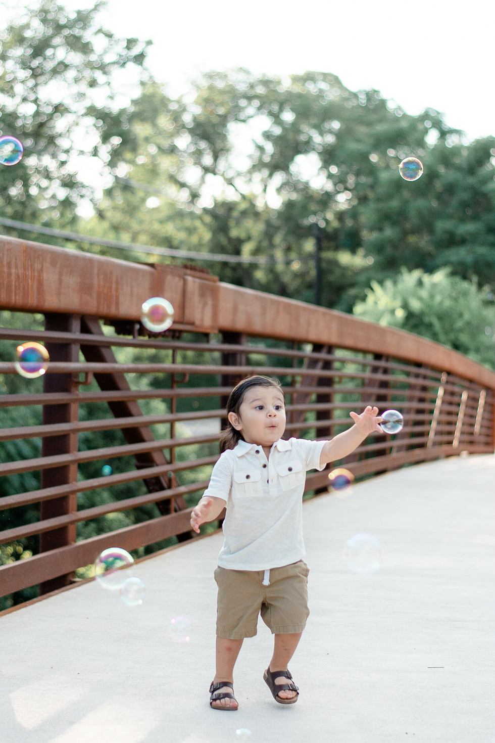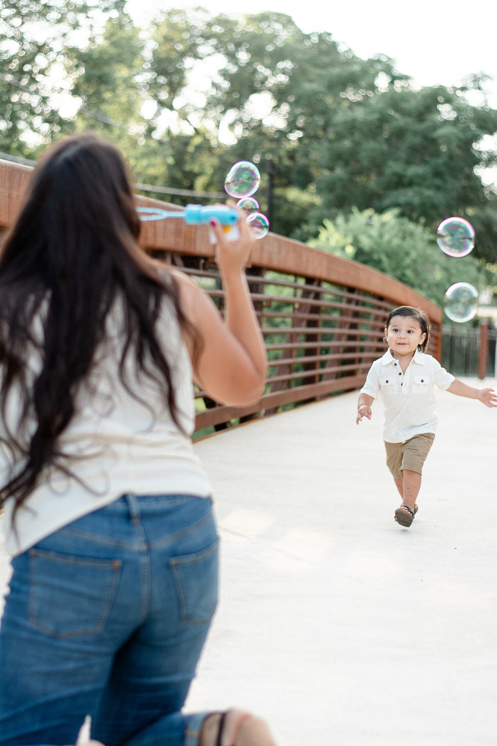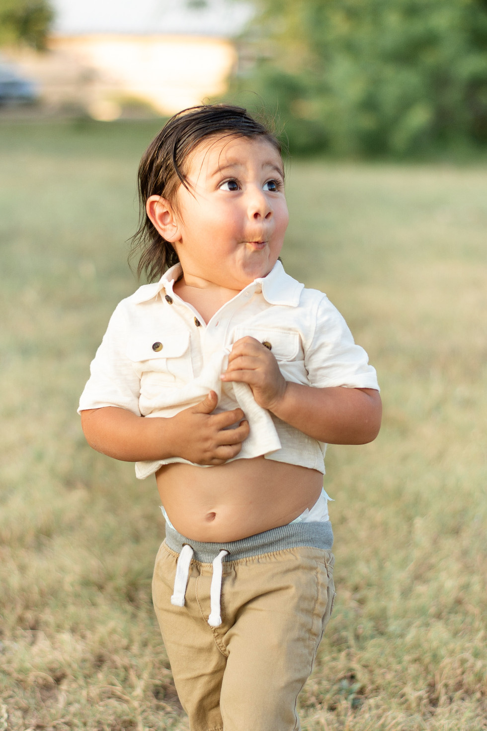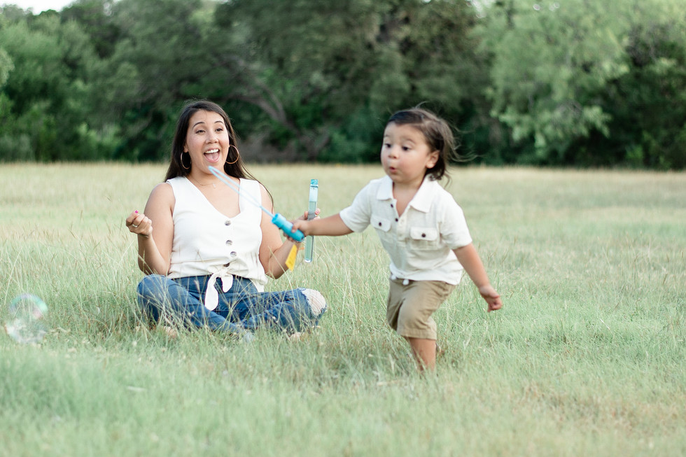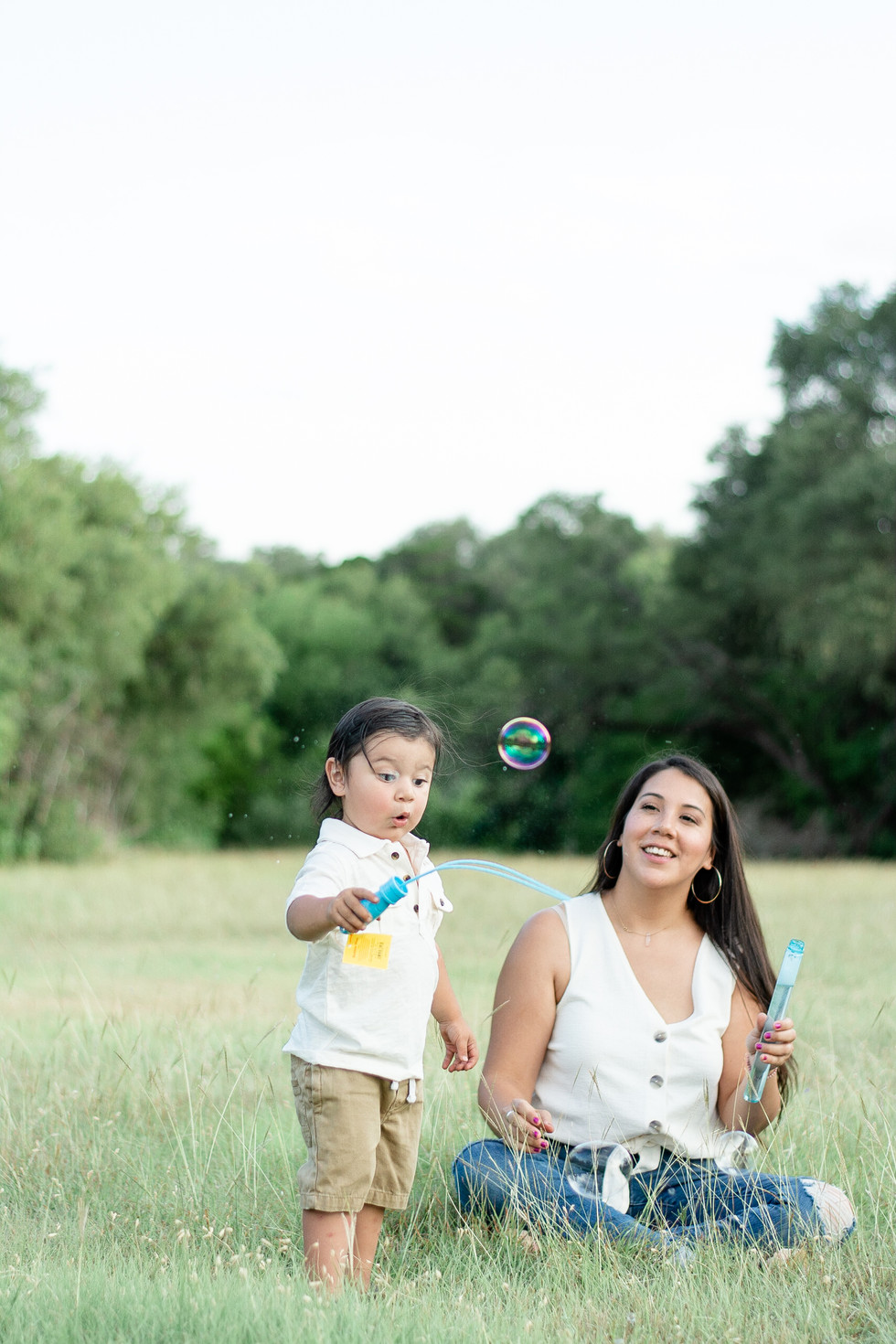 We met at a Shell Gas Station close to their house and headed toward small town Helotes. Vinny had a birthday recently so I brought a bag of goodies he would enjoy. Little did I know they would be used during the session. One of the first things he pulled out of the bag were the bubbles. Alyssa said they had a bubble machine at home so he was very familiar with them. After seeing the bubbles, not much else mattered and Alyssa quickly opened the bottle and watched her son gleam as the bubbles flew by him. Talk about some facial expressions! With the biggest 2 year old eyes, he kept me laughing with the faces he would make.